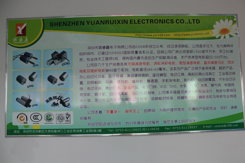 深圳市圓睿鑫電子有限公司自2008年創(chuàng)立以來,經(jīng)過誠信耕耘,在為期兩年的時間內(nèi),已通過ISO9001:2000國際質(zhì)量體系認(rèn)證。公司廠房占地面積2000多平方米,員工100人,專業(yè)技術(shù)工程師6名,擁有國內(nèi)最先進(jìn)的生產(chǎn)和檢測設(shè)備,年產(chǎn)各類減速電機(jī)超過2~300萬臺。因公司發(fā)展需要,于2020年底,將生產(chǎn)基地遷往擁有最美小鎮(zhèn)之稱的東莞市清溪鎮(zhèn),依山傍水,依托美麗的大自然環(huán)境和地方文化,全新的東莞市圓睿鑫電子有限公司將借助深圳母公司平臺,一步步走上新的臺階。